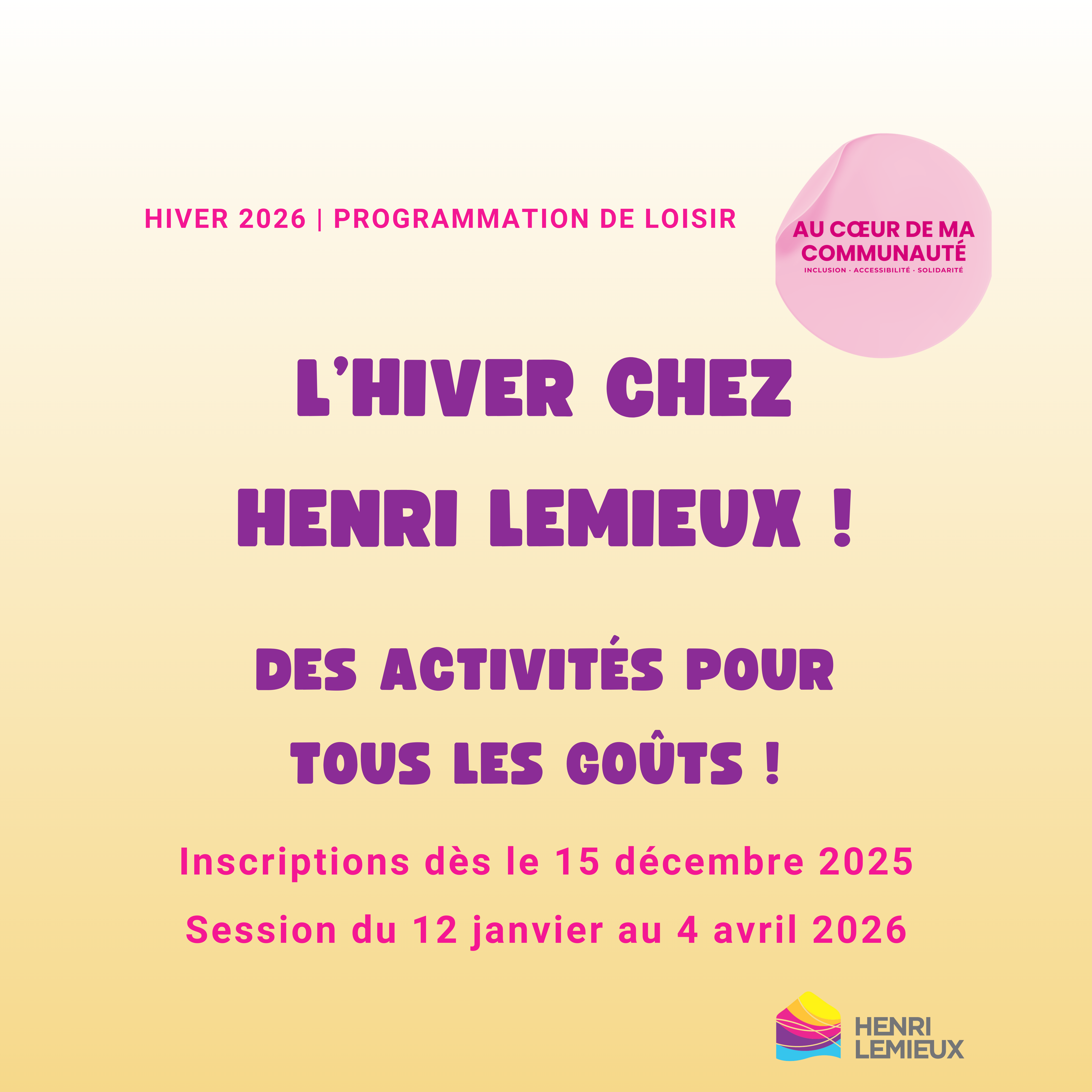 Henri-Lemieux, c'est 40 ans d'histoire. Henri-Lemieux, c'est le nom d'une figure phare du milieu communautaire et artistique de LaSalle. Henri-Lemieux, c'est un organisme qui favorise la pratique du loisir et la découverte des arts et des cultures de toutes les communautés. Henri-Lemieux, c'est une programmation abordable, accessible et inclusive pour petits et grands. Henri-Lemieux, c'est une famille chaleureuse.
